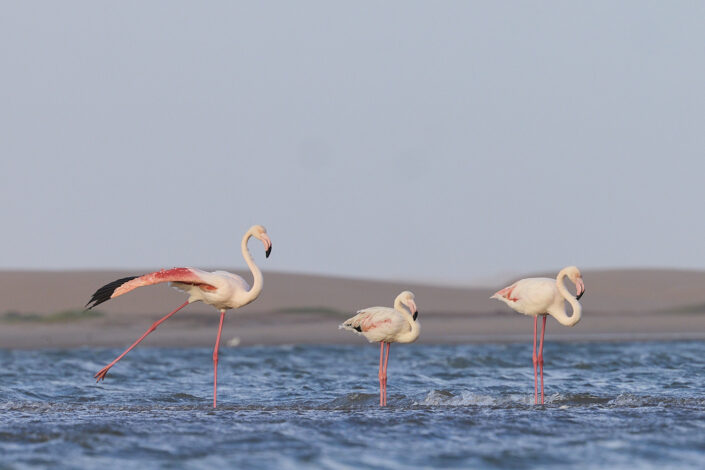 Flamingos in front of sand dunes the Sahara Desert in Morocco
