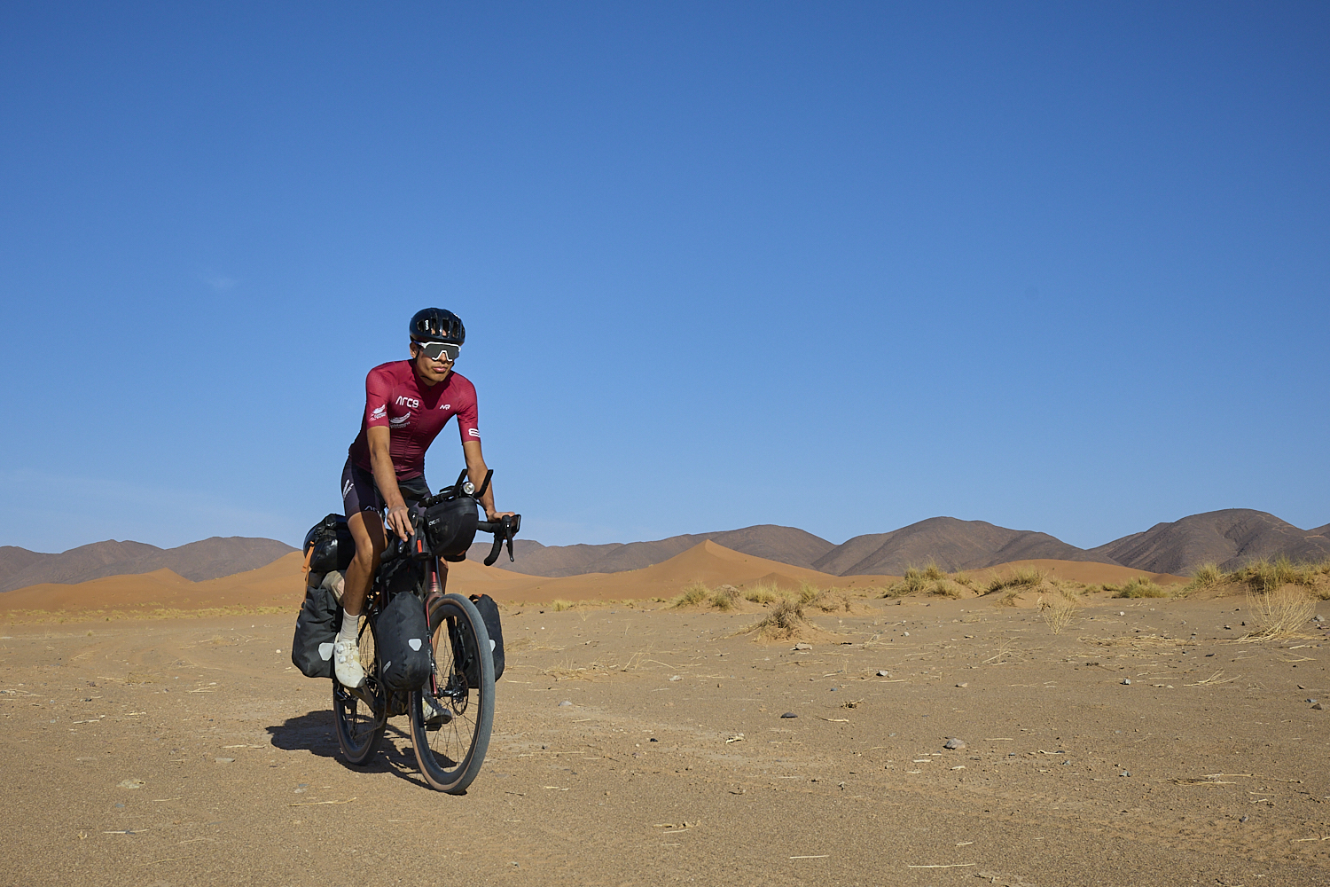 With the gravel bike, over 30 kg of luggage, and the relatively narrow 42 mm tires – rather slim for sandy terrain – making progress on the tracks is a real challenge. On sections with some sand and stones, full focus and skill are required; in deep sand, it becomes very exhausting pushing the bike. However, since I cover the vast majority of my tour on the road, I accept this as a trade-off between moving efficiently on the road and tackling the – relatively short compared to the overall distance – unpaved sections. So far, the ARC8 Eero has done an excellent job: over 3,500 kilometers to the Sahara without a single mechanical failure. Moreover, at least it feels like with every kilometer on the sandy tracks, my skills improve, and I almost get into a flow over the bumpy paths.