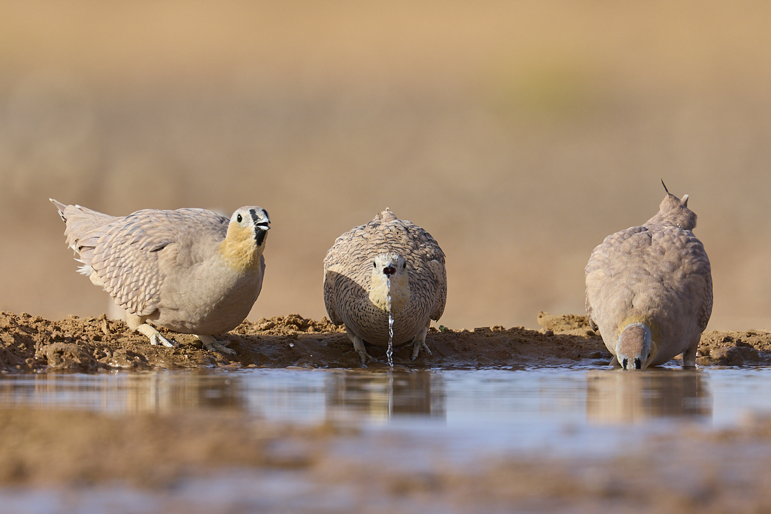 Other desert specialists high on my “wish list” are the sandgrouses. Every morning, they search in flocks for a suitable water source. To photograph them, I am, exceptionally, accompanied by a guide this time. The guide has prepared a waterhole, which he can fill with water immediately upon our arrival. As we wait, my tension rises – will the sandgrouses find the water source quickly today as well? First, we hear their calls. The calls grow louder and louder. Eventually, the flock flies over our heads. This spectacle repeats several times; they seem to be inspecting the water source. My index finger starts tingling with anticipation, but I cannot yet press the shutter. The sandgrouses are, so to speak, teasing me with their flybys. At the worst possible moment, a semi-wild donkey discovers the water source and quenches its thirst there. That silly donkey! Luckily, it doesn’t empty the trough entirely, so some water – and my hope of photographing the sandgrouses – remains. Shortly afterward, the sandgrouses land in the area again. They approach the water source on foot.
