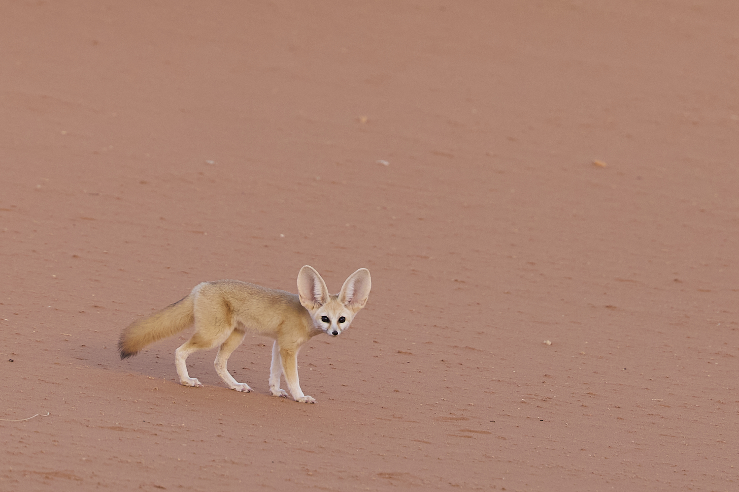 During my hikes in the dunes, I’ve already spotted tracks of one of the Sahara’s most famous animals several times. However, actually finding the fennec (or desert fox) itself at dusk is difficult. Since I had cycled all the way into the Sahara, I didn’t want to fail so close to my goal, so I contacted a photo guide. Judging by the many photos on his Instagram account, I was already dreaming of amazing fennec shots. With the guide, it shouldn’t be too difficult… Indeed, he quickly finds the first fennec.