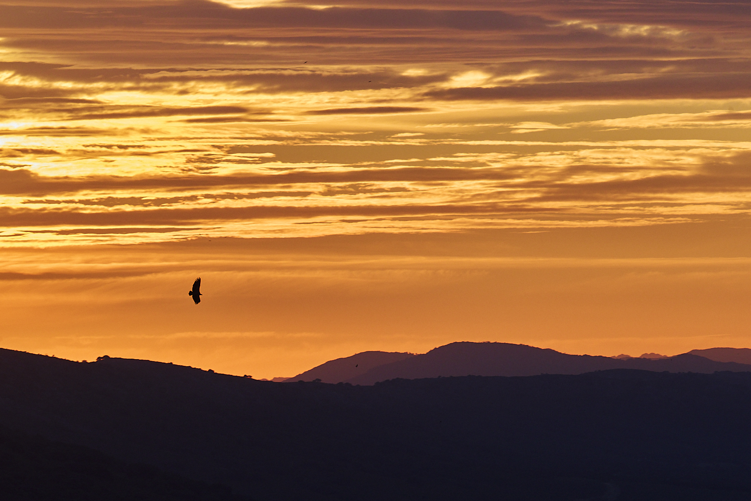 In front of such a backdrop, I would love to capture a vulture in flight. Due to the lack of thermals and therefore inactive vultures at this time, I haven’t been able to do so yet. Suddenly, I spot a vulture in the distance on the horizon, circling alone.