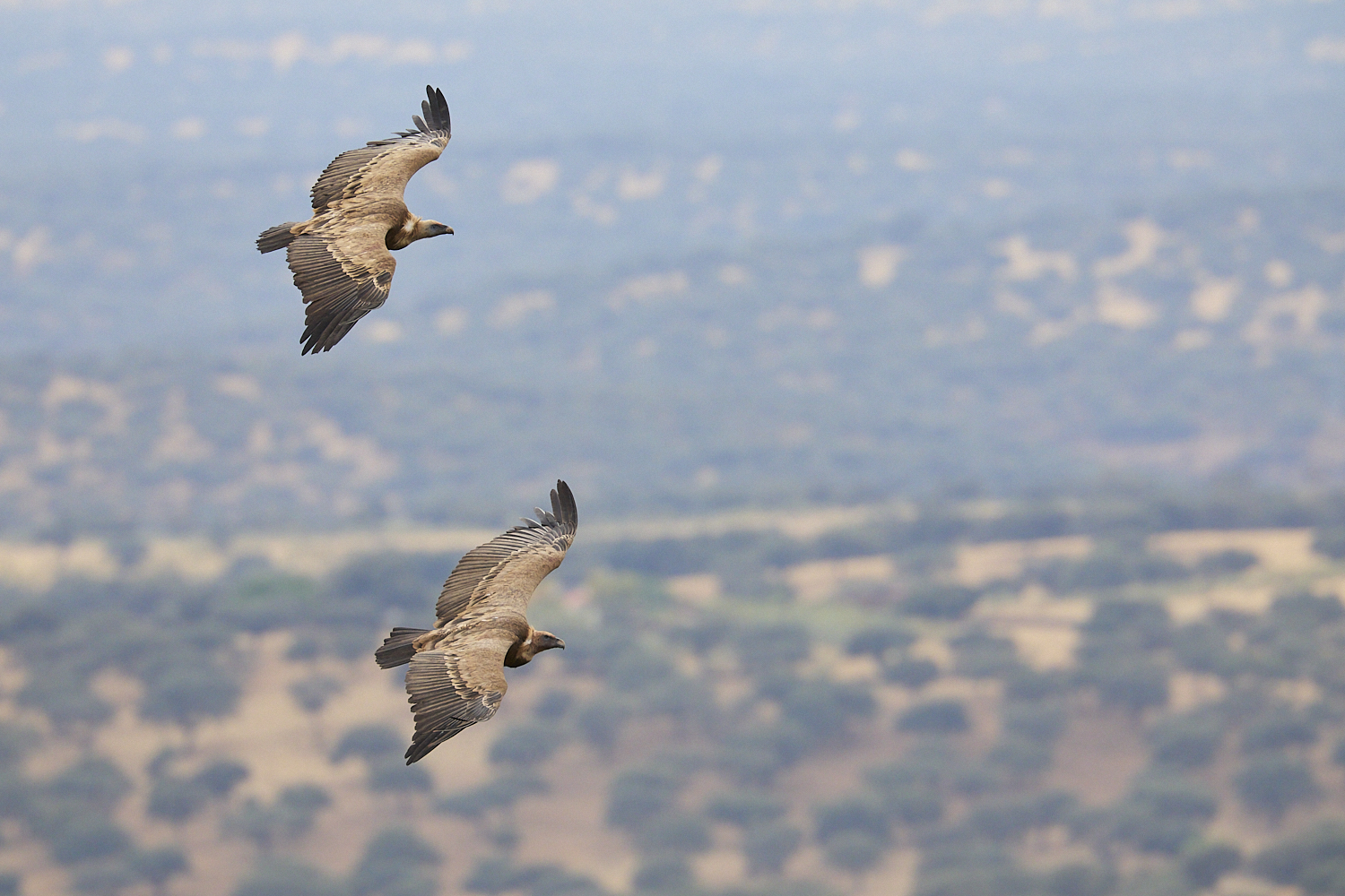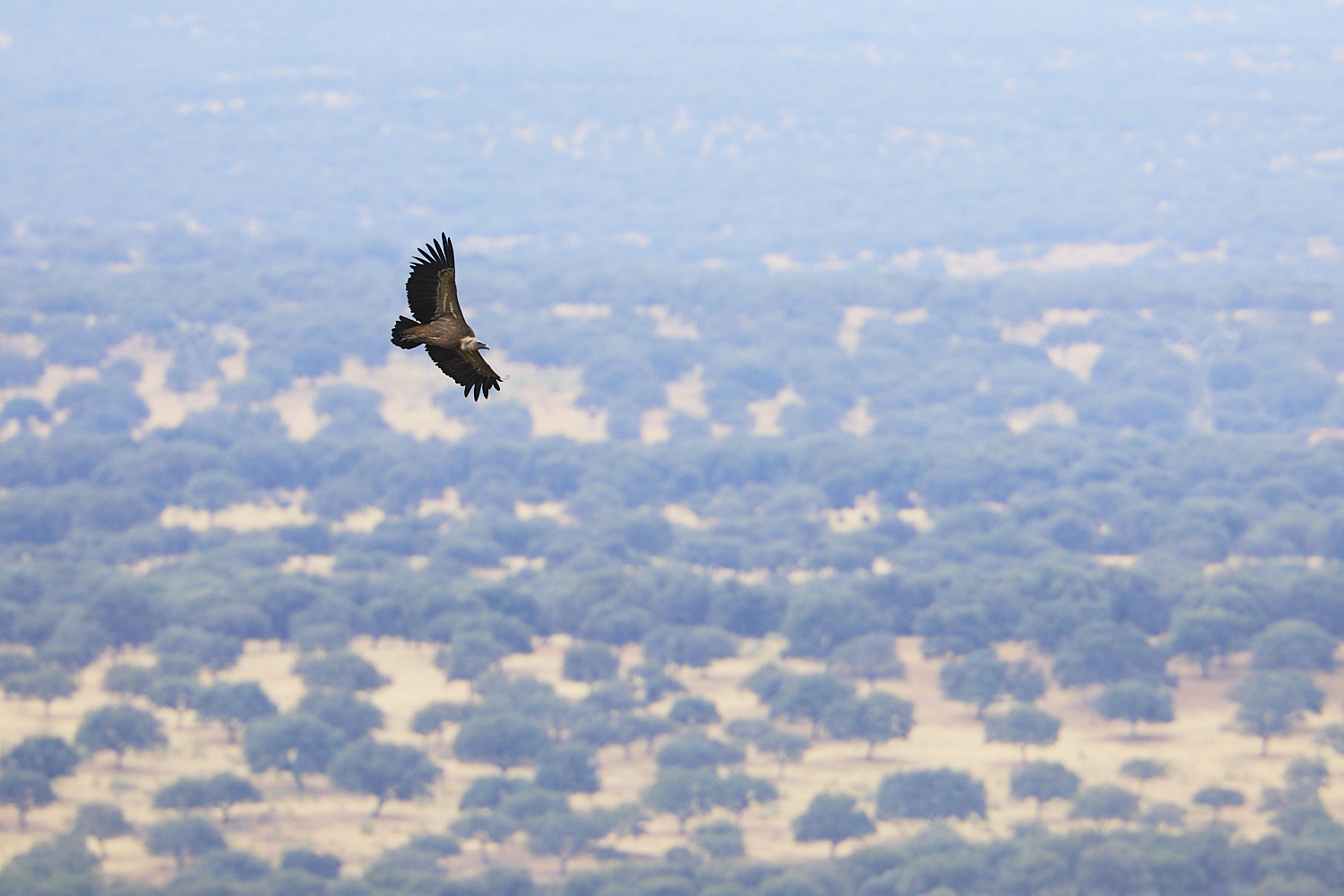 The typical semi-open grazing landscapes of Extremadura (Dehesas) stretch as far as the (vulture) eye can see. The oak trees are used for cork production, while the numerous livestock on the pastures are raised for meat production. If an animal dies beforehand, it becomes a ready meal for the vultures, which can dispose of the carcass in a very short time.