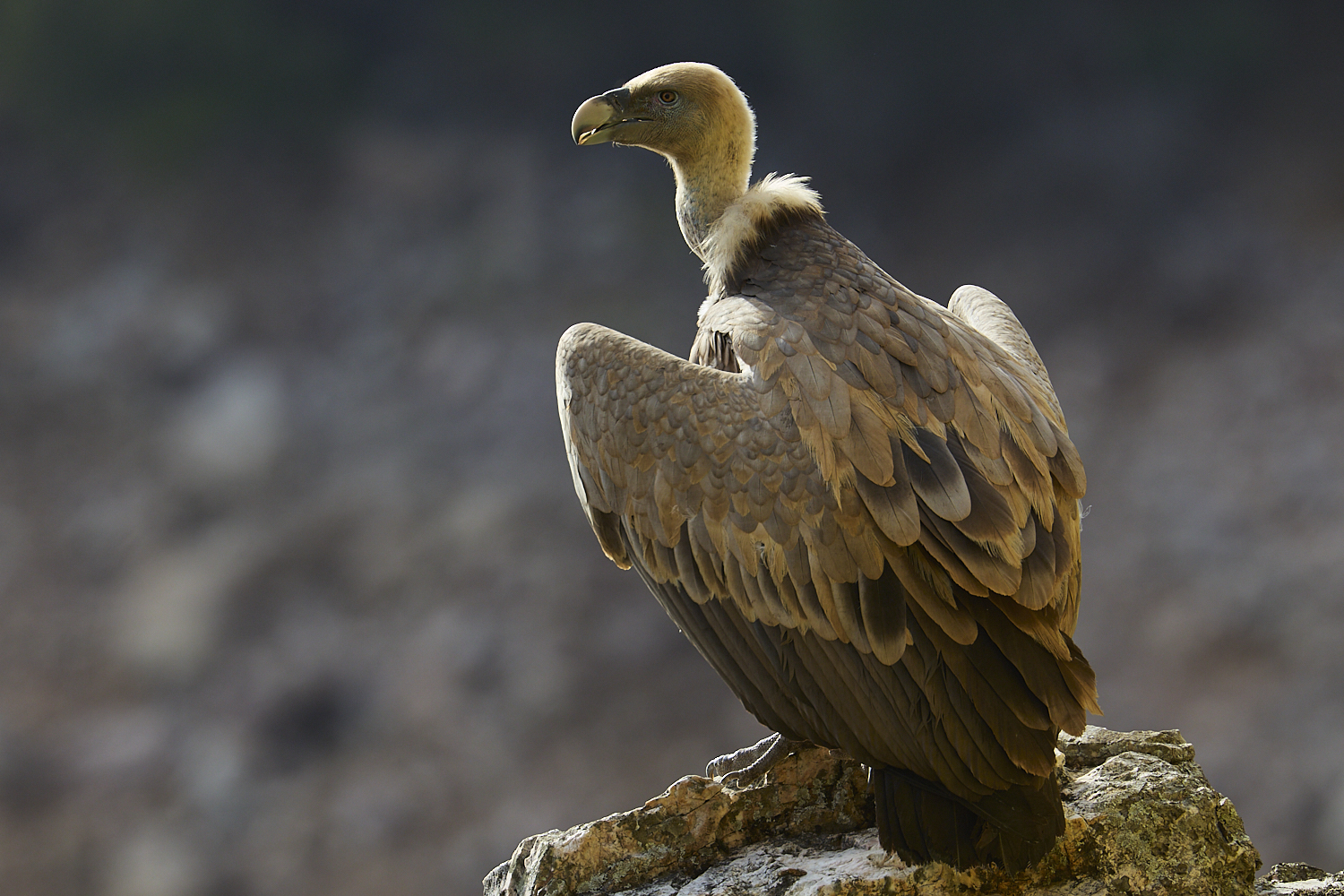 Since the thermals that vultures rely on usually only form under strong sunlight, the vultures, much to my dismay, are mostly active in extremely harsh light – exactly the opposite of what I would want for my photos. That’s why I was all the more delighted when, upon my arrival in the afternoon, a layer of clouds covered the sun, and yet some vultures still settled on the rocks at eye level. For once, the vulture even posed, and I was able to position myself so that the opposite cliff face appeared in the background. Only the friendly look (or providing some action) is something it could still practice a bit.