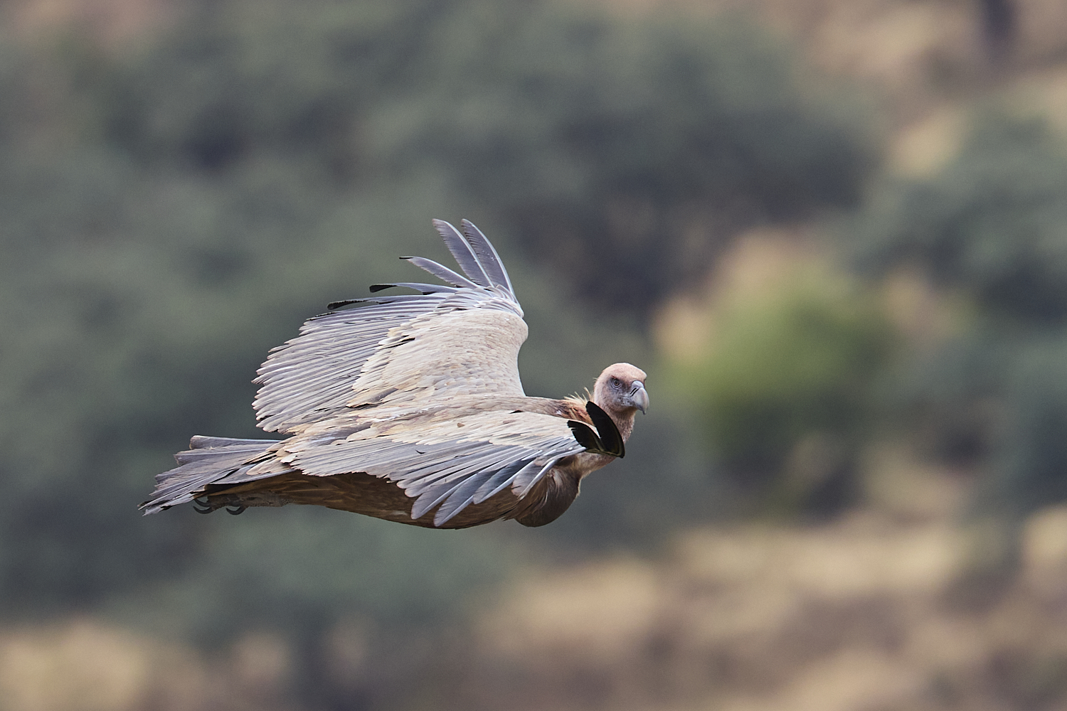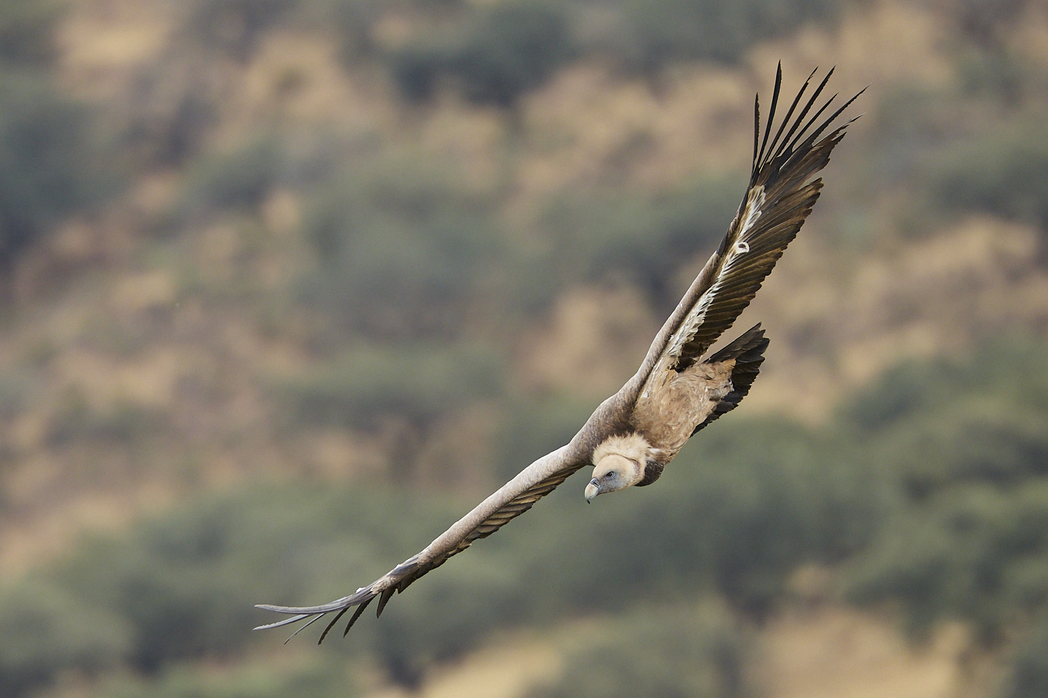 In flight, they show hardly any fear and repeatedly fly close past me. The full crop reveals that this griffon vulture has likely enjoyed a hearty meal.