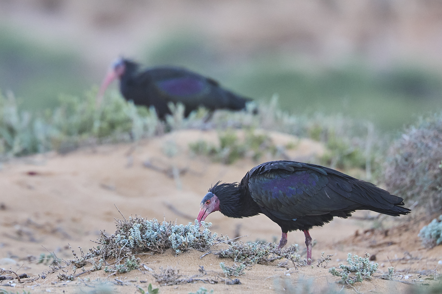 Angestrengt halte ich während dem Velofahren Ausschau nach verdächtigen schwarzen Flecken in der Landschaft. Doch bis anhin entpuppen sich alle sehr rasch als Abfall. Gar nicht so einfach, gleichzeitig den Verkehr im Blick zu haben – in Marokko kann jederzeit ein Auto oder gar LKW auf der eigenen Spur entgegenkommen – und nach Tieren zu suchen. Auf dem aktuellen Strassenabschnitt wurden in den Tagen zuvor im Internet noch Sichtungen meiner Zielart gemeldet. Nach mehreren Stunden und über 50 zurückgelegten Kilometern entlang dieser eigentlich vielversprechenden Strecke konnte ich allerdings auch nicht eine einzige flüchtige Beobachtung dieser Vögel verzeichnen. Daher macht sich bei mir langsam, aber unaufhaltsam Ernüchterung breit. Vielleicht war es doch etwas optimistisch, alleine und mit dem Fahrrad eine der seltensten Vogelarten der Welt zu suchen? Zumal ich zwecks Gewicht- und Platzoptimierung nicht einmal einen kleinen Feldstecher dabei habe. Während ich mein Vorhaben immer stärker hinterfrage und mich wundere, wie ich die Vögel auch nur finden soll, entdecke ich in einiger Entfernung über dem Atlantik immerhin Basstölpel. Ganz blind scheine ich also nicht durch die Gegend zu fahren. Und dann tauchen auf einmal zwei schwarze Vögel am Strassenrand auf. Yes, meine Suche nach dem Waldrapp ist doch noch von Erfolg gekrönt! Im sandigen Boden stochern sie mit ihrem charakteristischen roten Schnabel nach Fressbarem.