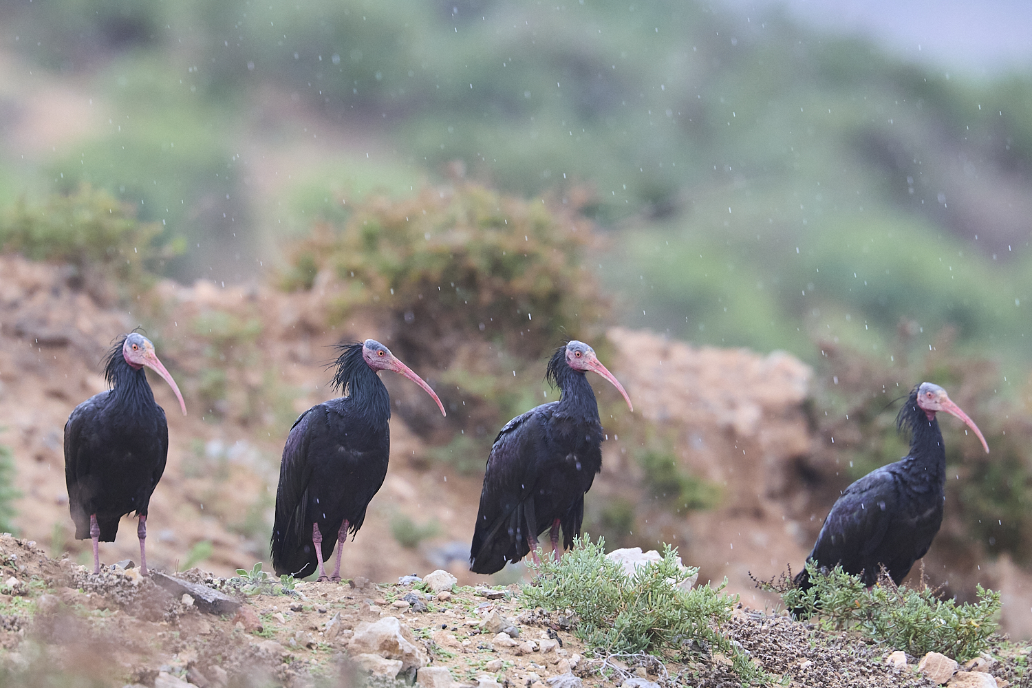 Nach dem Regenschauer müssen die Waldrappe vor der Fortsetzung des Fotoshootings die Federn richten. Wenn man schon eine Glatze hat, sollten wenigstens die restlichen Federn sitzen.